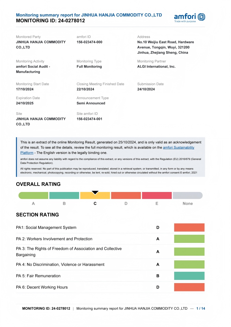 2025 m. Liepos mėn.,„Jinhua Hanjia Commodity Co.“, Ltd.Sėkmingai įgijo C lygio sertifikatą Tarptautinės standartų (ICS) gamyklos audito programos klasifikacijoje, kurią vykdo trečiųjų šalių Europos tikrinimo agentūra, kurią paskyrė kooperatyvo sąjunga Enseigne. Šią sertifikavimo sistemą sudaro keturios pakopos: A, B, C ir D., kaip Prancūzijos prekybos ir pramonės rūmų (FCD) narys, įmonė laikosi Tarptautinės darbo organizacijos socialinio valdymo schemos standarto SA8000, įgyvendindama savo tiekėjų socialinės atsakomybės auditą.